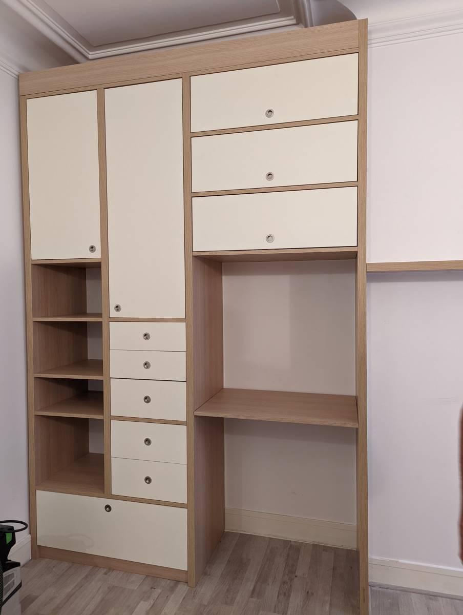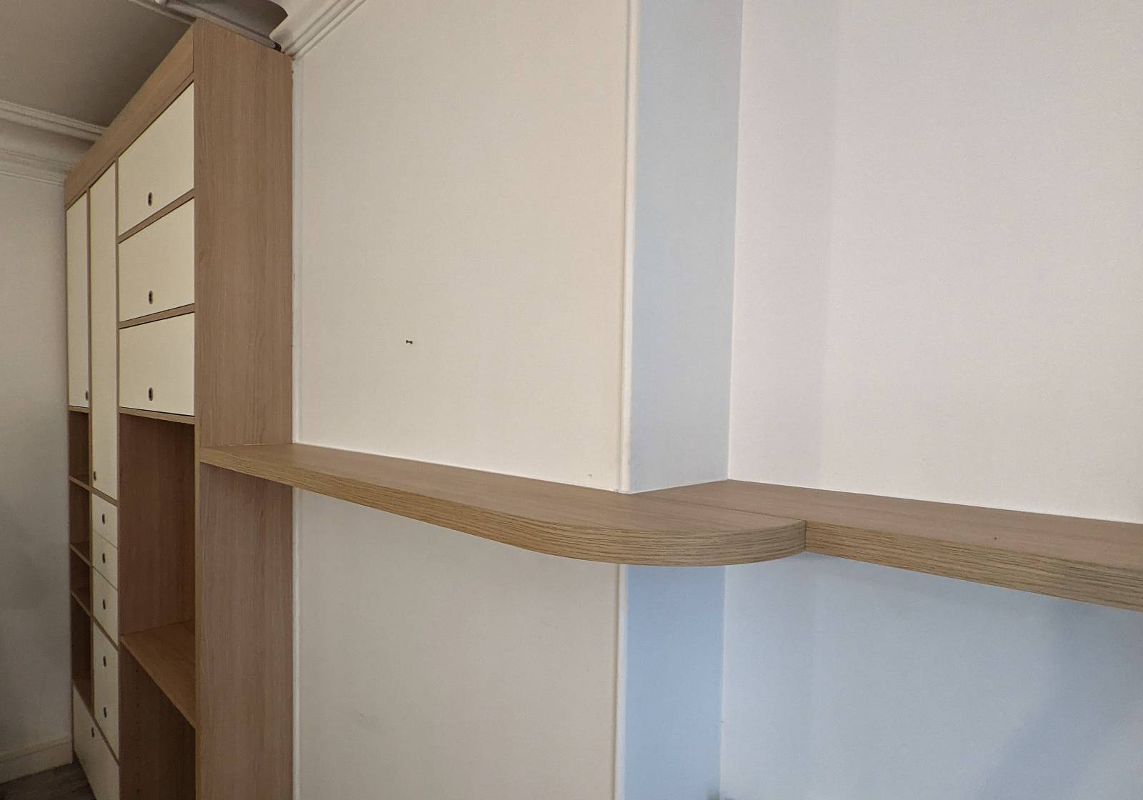 Dans une chambre d'enfant (projet Paris Greuze, cf photo), ce dressing a été pensé par My Fair Design pour évoluer avec son petit habitant. Le bureau est une planche qui peut être placée à plusieurs niveaux adaptables à la taille de l’enfant.