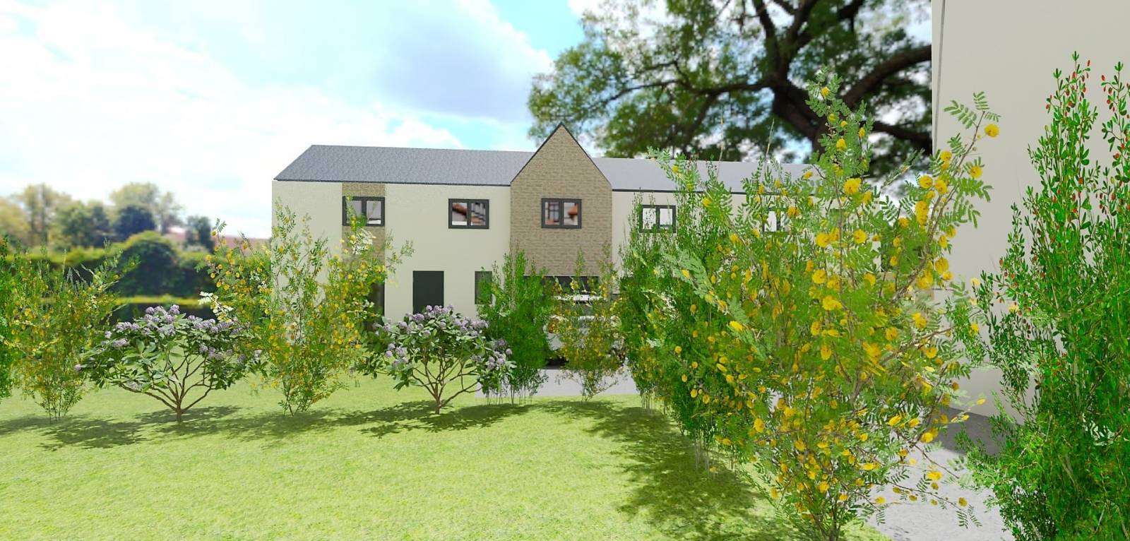La conception 3D présente deux maisons, de superficies équivalentes mais aux esthétiques légèrement différentes, pensées en harmonie avec les deux autres biens à rénover. La tradition de la pierre en façade se marie avec la modernité des menuiseries en aluminium. Les toits réalisés en ardoise donnent toute leur élégance aux deux nouvelles constructions.