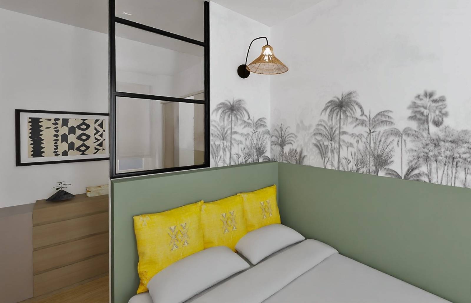Le papier peint panoramique tropical et le mobilier en bois clair (type chêne) s’harmonisent avec le parquet. La déclinaison de verts (sur le mur de la tête de lit ou bien par touches sur le mobilier ou en déco si l’on souhaite un rendu plus sobre) est une ode à la nature. Tous les éléments sont réunis pour créer une pièce dédiée à la détente et au repos. La touche de jaune (que l’on place par petites touches sur les coussins, le linge de lit ou en détail déco) participe à la création d’une atmosphère chaleureuse qui permet de twister et réhausser cette palette de couleurs froides. Le jaune, lumineux et vitaminé, confère énergie et dynamisme.