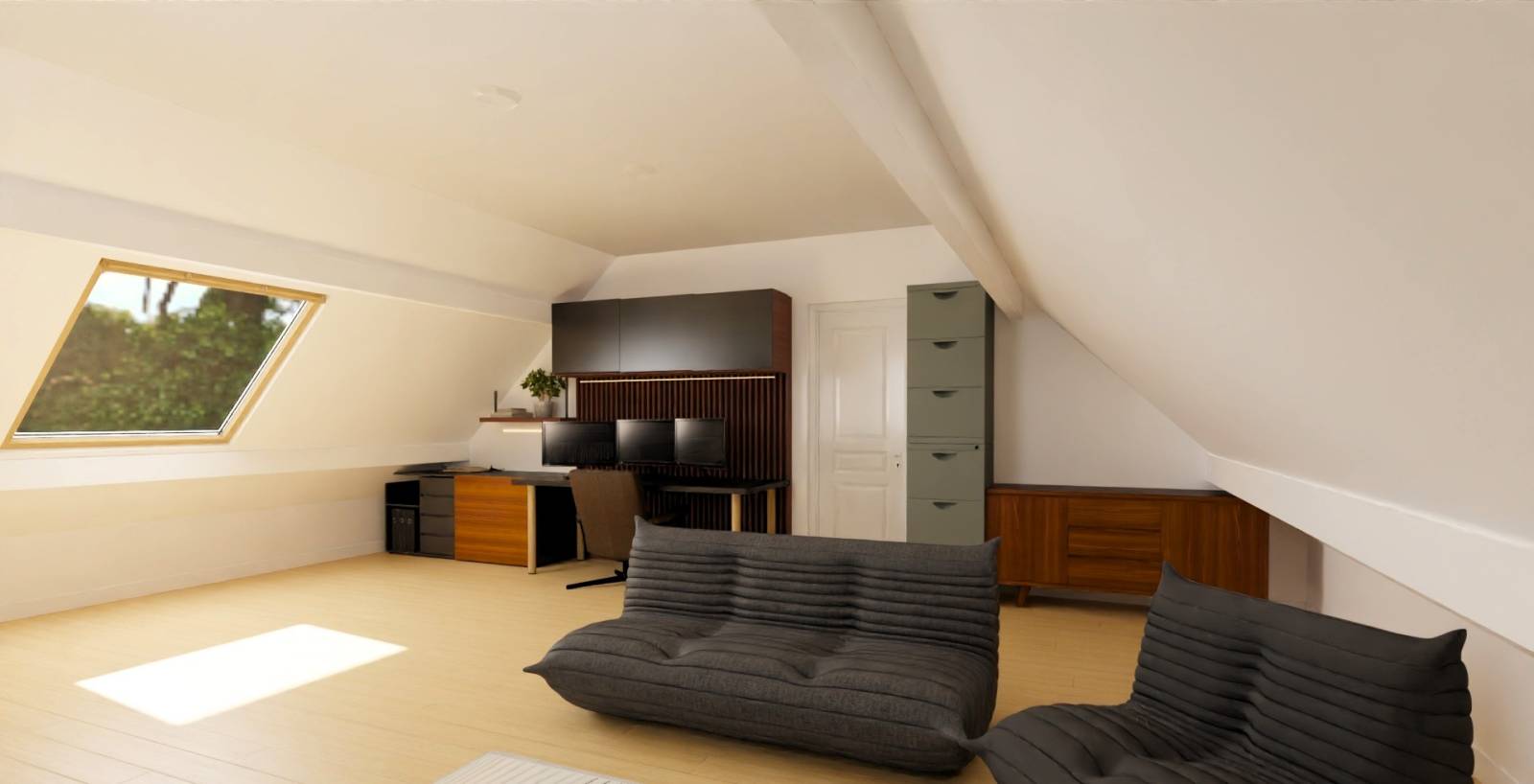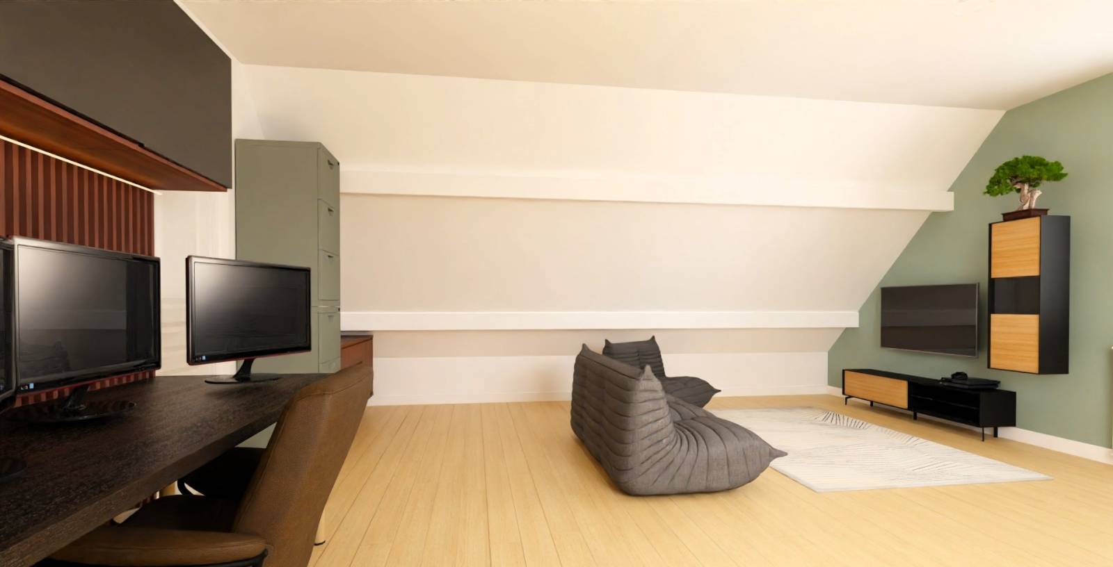 La pièce se veut à la fois minimaliste et épurée, pour travailler ou se détendre dans un espace zen, agréable et dénué de superflu. La touche vert sauge au mur permet de rehausser, de valoriser les éléments noir et bois par contraste tout en accentuant cet effet nature recherché. Ce qu’on recherche ? De la légèreté, des éléments qui nous rappellent la nature, un cocon où se mêlent le beau et le bien-être.